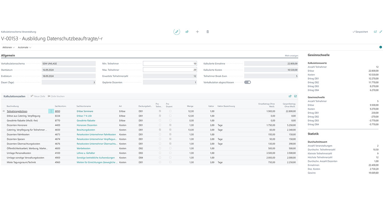 Für eine professionelle Planung und Durchführung einer Veranstaltung ist eine fundierte Kalkulation unerlässlich. Unsere ganzheitliche Seminarverwaltungssoftware kommt mit einer integrierten Finanzbuchhaltung daher und bietet Ihnen somit die Möglichkeit zur Erstellung einer Vorkalkulation für jede Veranstaltung.
